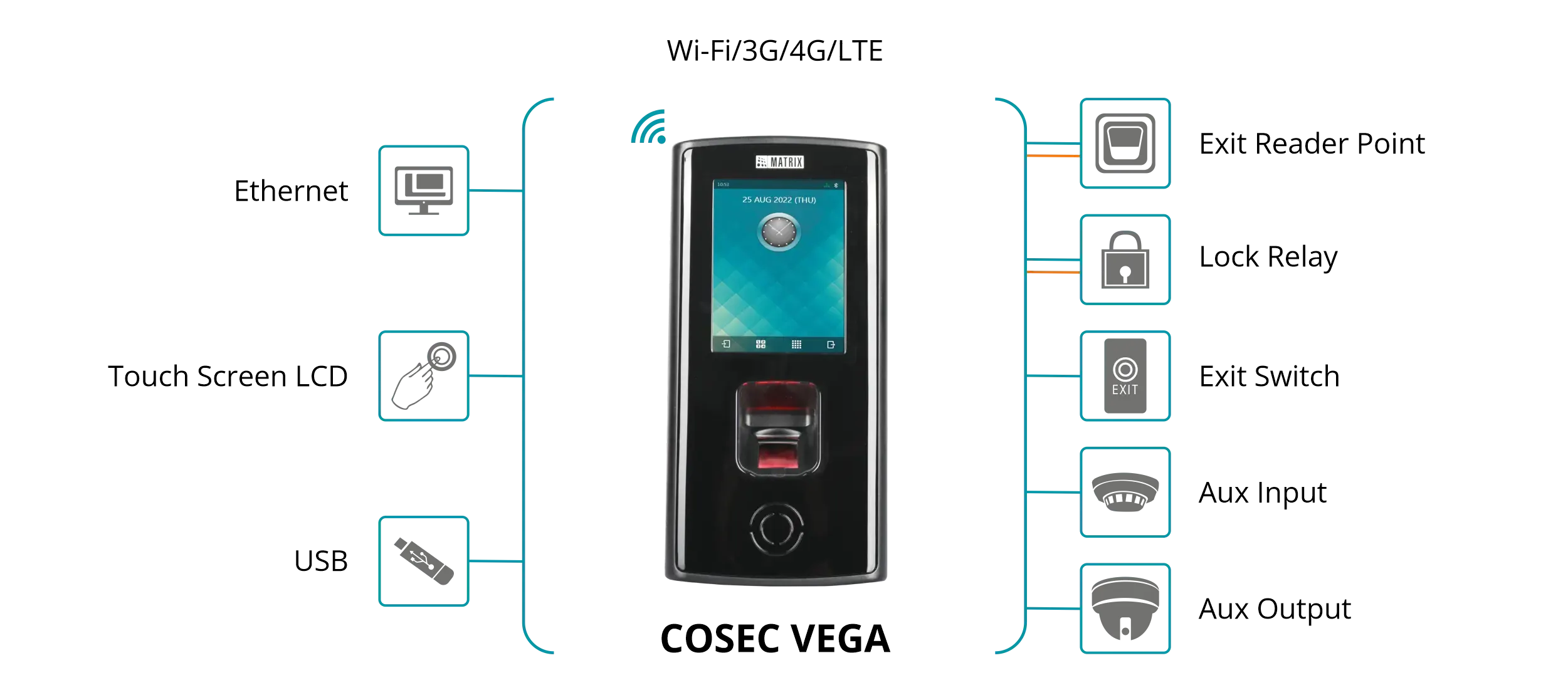 This device also boasts multiple connectivity options such as Wi-Fi, PoE, Ethernet, USB, 3G/4G/LTE, and Bluetooth® to ensure seamless integration with existing security systems. The Cosec Vega Fax is built with IP65 ingress protection and includes a 3.5" TFT display with a capacitive touch panel, making it suitable for deployment in a wide range of environments, including high-traffic and harsh settings.